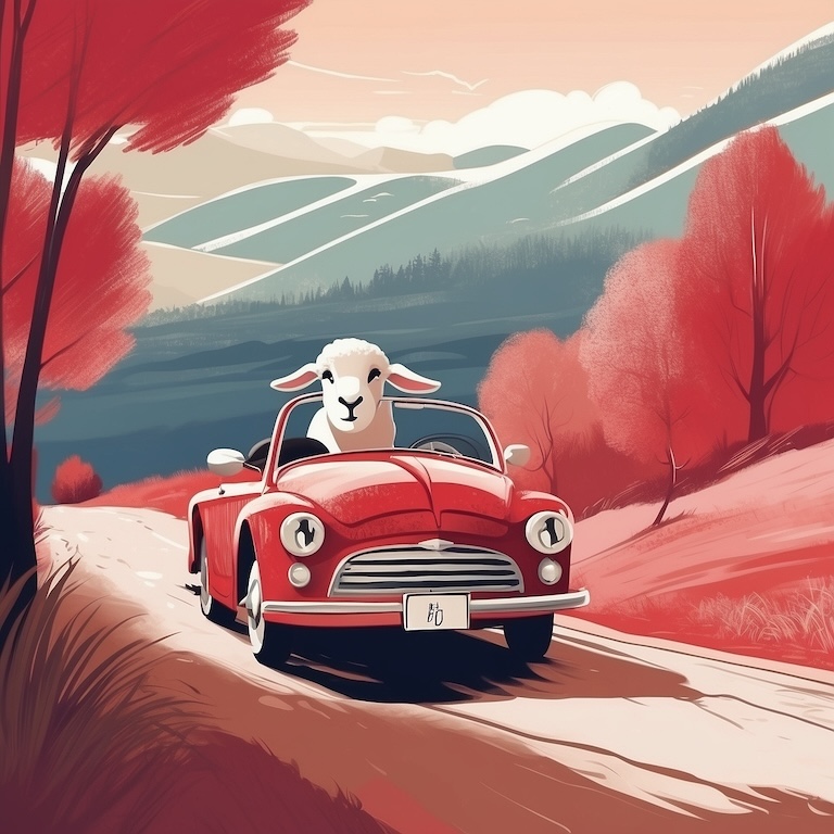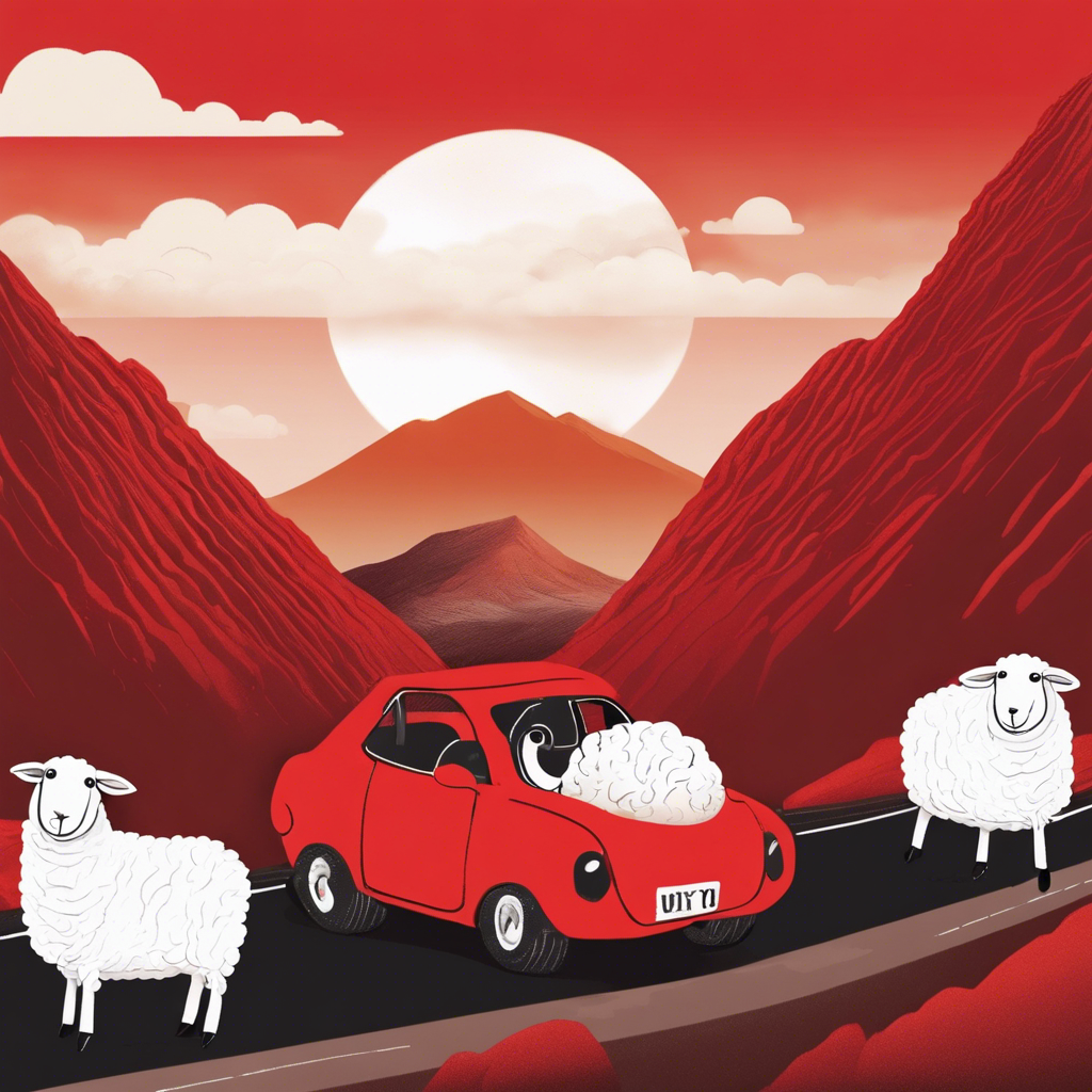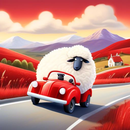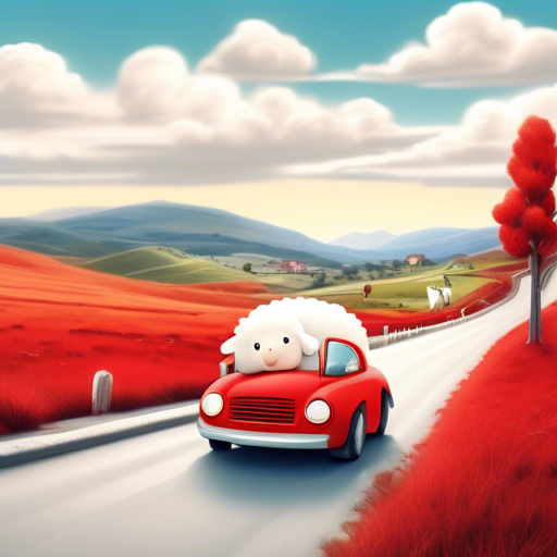 In the tranquil expanse of a picturesque countryside, where rolling green hills meet the azure sky, a fluffy white sheep confidently takes the helm of a shiny red car, navigating its way along a winding road with an air of determined curiosity and adventurous spirit.