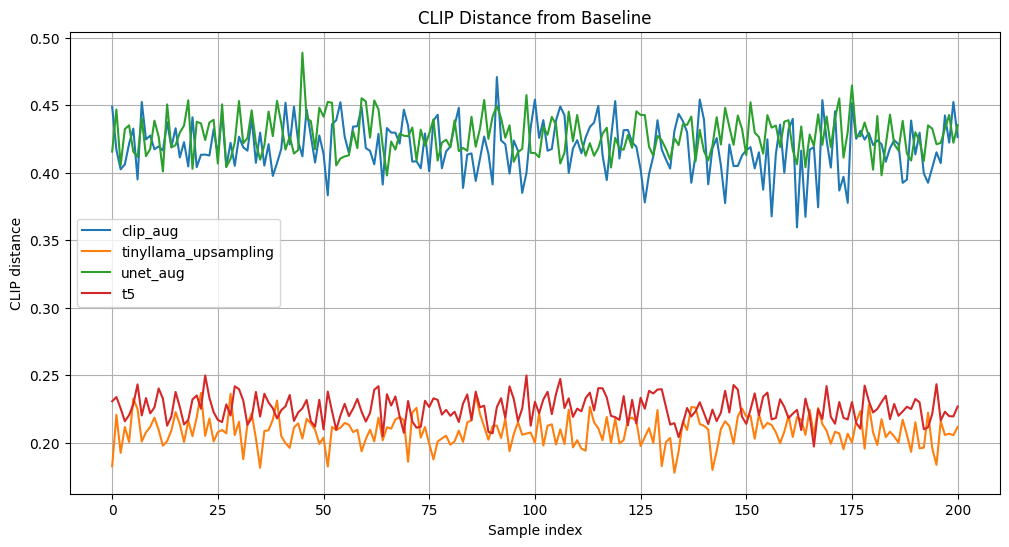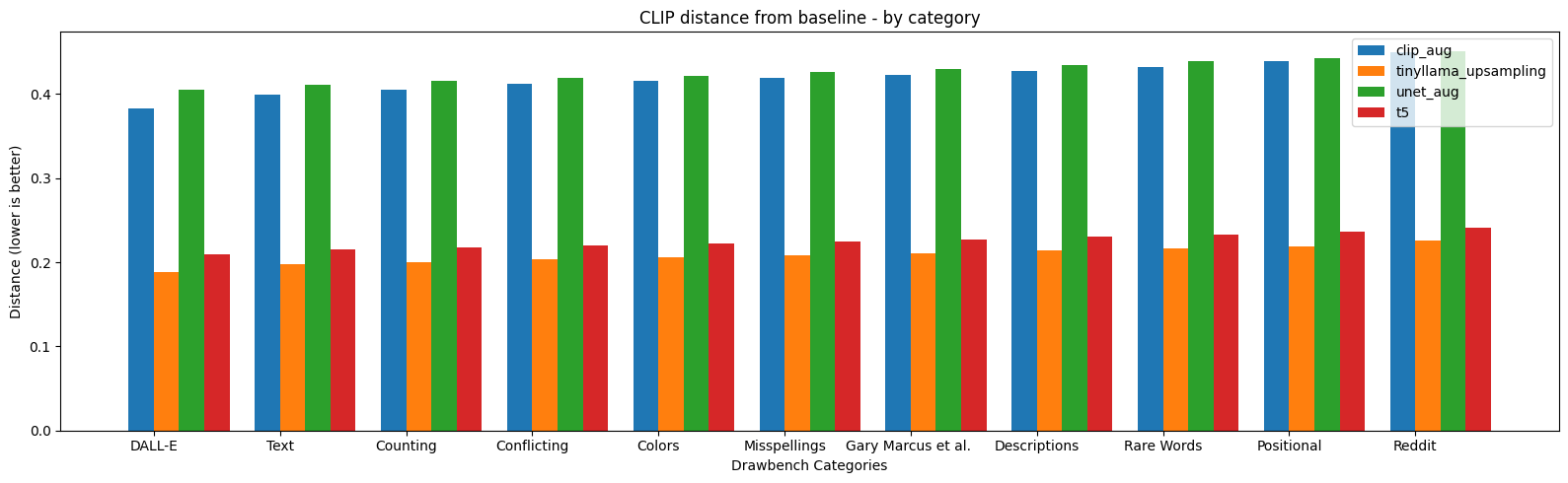 - Evaluation results are below; both were gathered on the Drawbench dataset. This uses the CLIP distance of the generated image with SDXL, at 40 steps and the Euler sampler, from the original prompt as the metric. You can see how wide of a gulf there is between the U-net and CLIP aug methods, and the LLM-based methods.