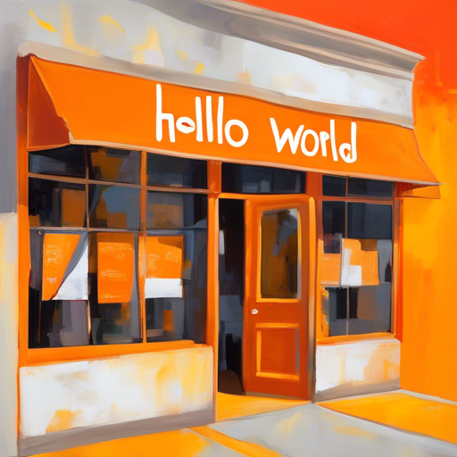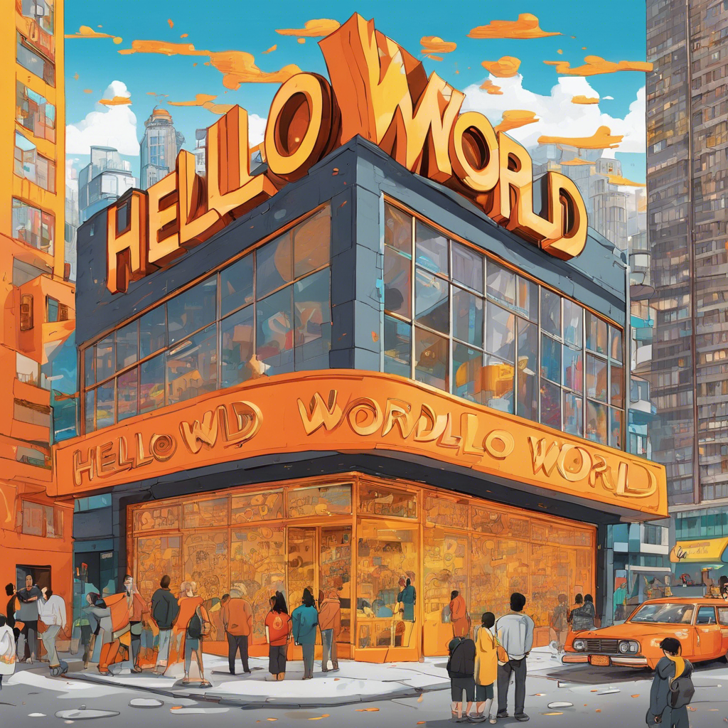 The storefront of "Hello World" is painted in vibrant shades of orange and yellow, with the words "Hello World" written in bold, cursive letters across the front. The storefront is surrounded by a bustling cityscape, with skyscrapers and neon signs lining the walls. The storefront is surrounded by a sea of people, all gazing up at the sky with a sense of excitement and excitement.