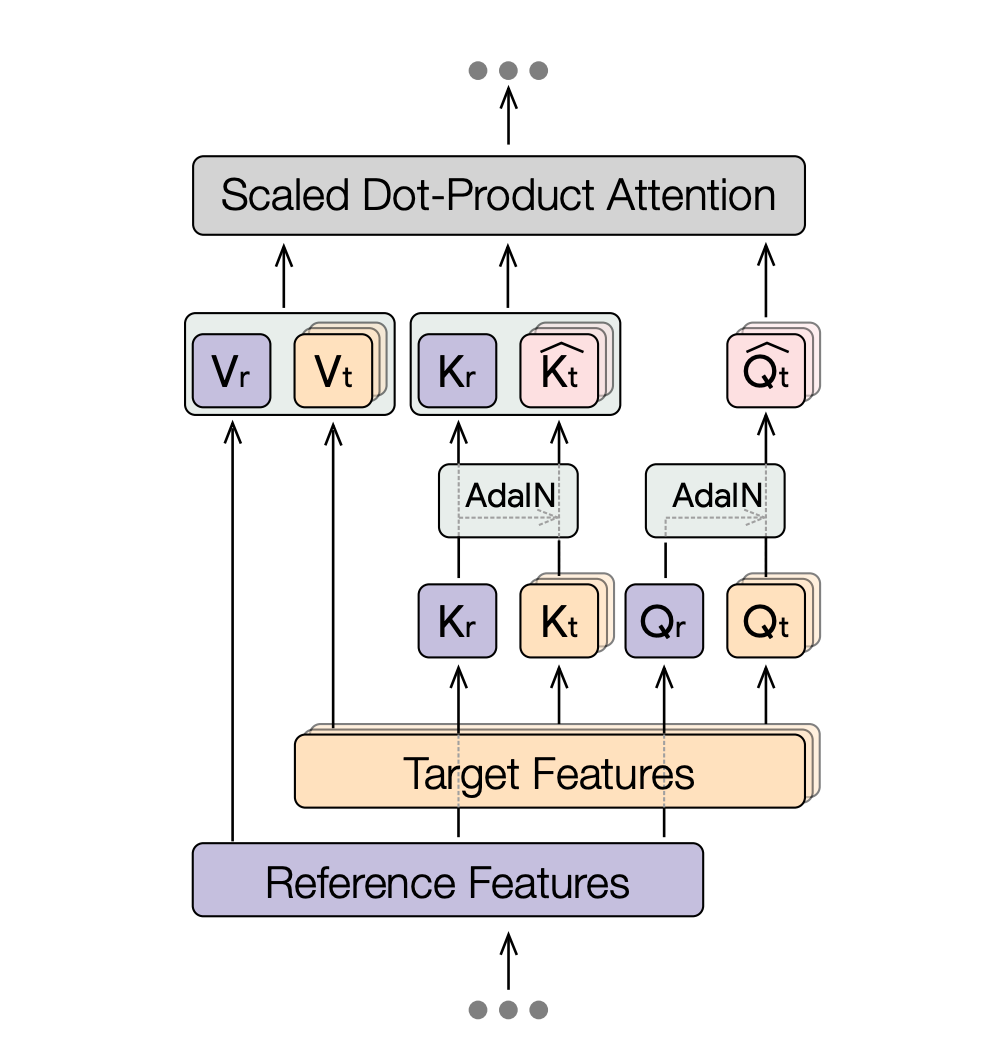 Where the QKV values also take input from a reference latent. In the case of the K and Q values, AdaIN is applied first; i.e., the values of Q and K are shifted and normalized to match the mean and standard deviation of the reference latent. The V values are then shifted and normalized to match the mean and standard deviation of the source latent. This allows the model to generate images that are in the style of the source latent, but with the content of the reference latent.